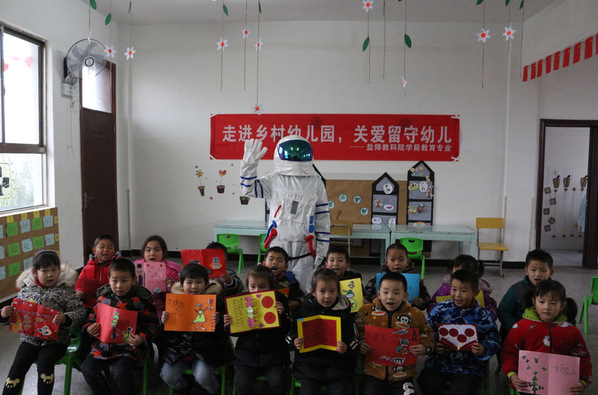下午,志愿者们来到了射阳县川彭小学一年级,课前热身活动《披萨歌》、《东西》等调动了现场的气氛,随后开展的集体游戏《桃花朵朵开》更是将现场气氛推向一个新的高潮。沈颖老师就科普读物《探索太空》逐层递进地给孩子们讲解有关宇宙行星的知识,孩子们积极讨论、认真思考、踊跃回答,现场气氛活跃,一张张红扑扑的小脸上充满着对知识的渴望。随后,孩子们热切期盼的“宇航员”登场了,给大家带来了新年贺卡,传递了来自盐城市格林幼儿园孩子们的祝福。随后,孩子们在老师的指导下进行贺卡回赠活动。剪卡纸、写祝福、画图案,孩子们在志愿者们的协助下热火朝天的进行着,希望用自己手工制作的新年贺卡表达对盐城市格林幼儿园小朋友的感谢,同时也祝愿他们在新的一年中能够开开心心,茁壮成长!