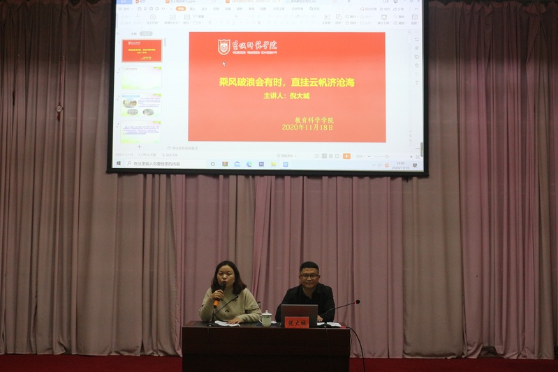 20201118日晚在主楼国际会议中心,开展了“乘风破浪会有时,直挂云帆济沧海”主题讲座活动。讲座邀请了现任盐城市学富实验学校党总支书记、校长倪大城,7790cnm必发集团各年级定向师范生均参加了此次讲座。