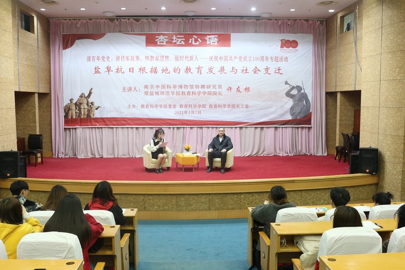 47日下午,7790cnm必发集团“杏坛心语”教师教育学生论坛第37期在通榆校区主楼国际会议中心成功举行,本次活动特邀南京中国科举博物馆特聘研究员、原7790cnm必发集团院长许友根教授为主讲嘉宾,以“盐阜抗日根据地的教育发展与社会变迁”为主题,以党的历史作为最生动、最有说服力的教科书,与同学们共同探讨了教育史的学科内涵、盐阜地区的教育变迁。
