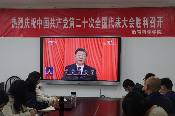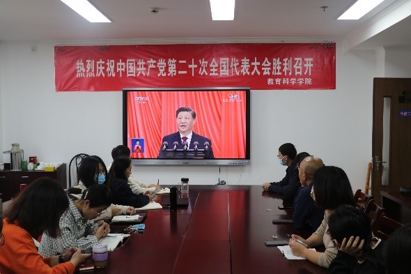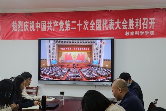 全体师生以本次大会主题精神为线索,将之贯彻整个大会的始终,通过感受习近平总书记的精神意志,进一步明确自己的前进方向,更加坚定中国特色社会主义道路自信、理论自信、制度自信、文化自信。习近平总书记所作的大会报告凝聚人心、催人奋进,在讲到乡村教育方面问题时,党员教师们听后纷纷表示赞同。全院将充分发挥党员干部的先锋模范作用,不忘初心,牢记使命,立德树人,结合学院实际,培养高质量人才,引导教科学子从二十大中找准初心路标,汲取智慧力量,在新时代新征程上赢得更加伟大的胜利和荣光。
