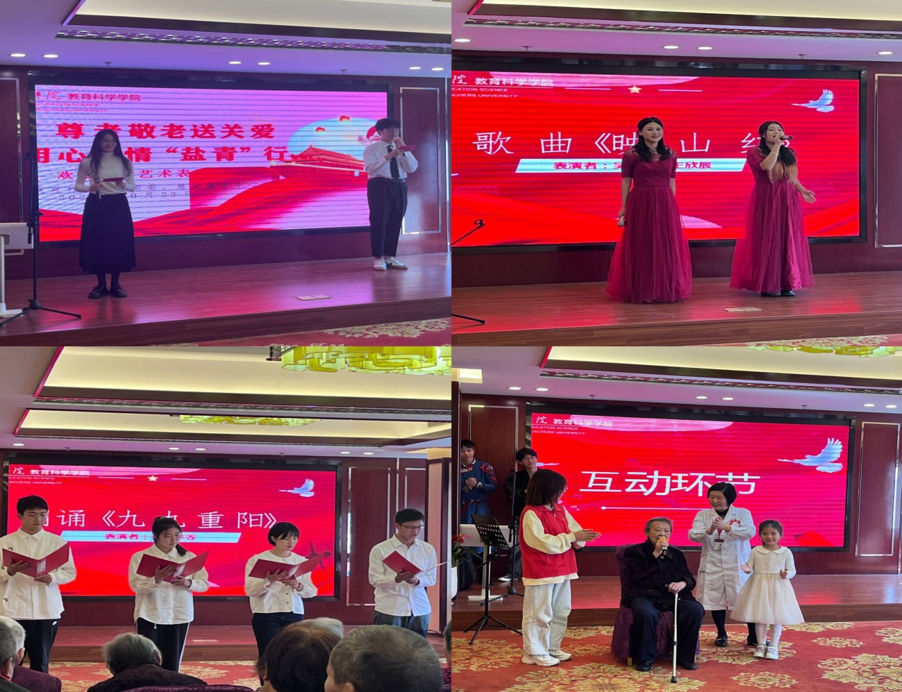 “没有共产党就没有新中国……。”10月23日上午,7790cnm必发集团“盐青先行”党团志愿服务团队31名志愿者走进了慈悦康养中心,为老人们送去慰问品和文化大餐。活动现场,志愿者和同学们为老人精心准备了朗诵、舞蹈、拳击,民族舞蹈、大合唱等各类才艺展示。“没有共产党就没有新中国”、 “唱支山歌给党听”等红色歌曲引起了在场老人们的共鸣,大家跟着演唱,将演出推向一个又一个高潮,平日安静的养老院增添了几分喜庆和热闹的色彩。汇演结束后,志愿者们和老人们一起谈心散步,回忆往昔艰苦岁月,感慨今日盛世繁荣。短暂的志愿服务活动使老年公寓充满了欢声笑语,也使同学们在实际行动中深刻感悟孝老爱亲的传统美德。