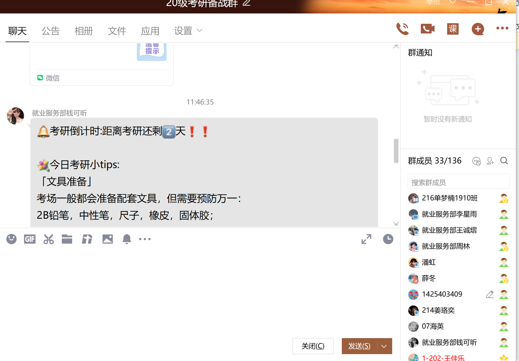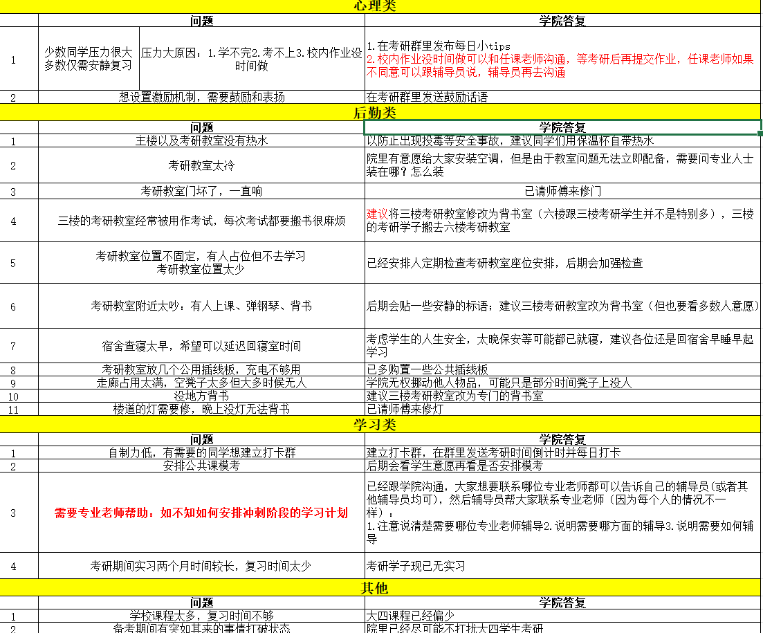 定点服务,温情护航。为做细考研学子服务工作,学院积极组织各年级开展考研经验交流会,帮助同学们更好的应对考研疑惑,改进自身学习方法,提高学习效率。此外,学院还通过定期发放问卷、建立考研打卡自律群、准备考研小“惊喜”、定点解决问题等举措关心学生,提升考研学子信心。