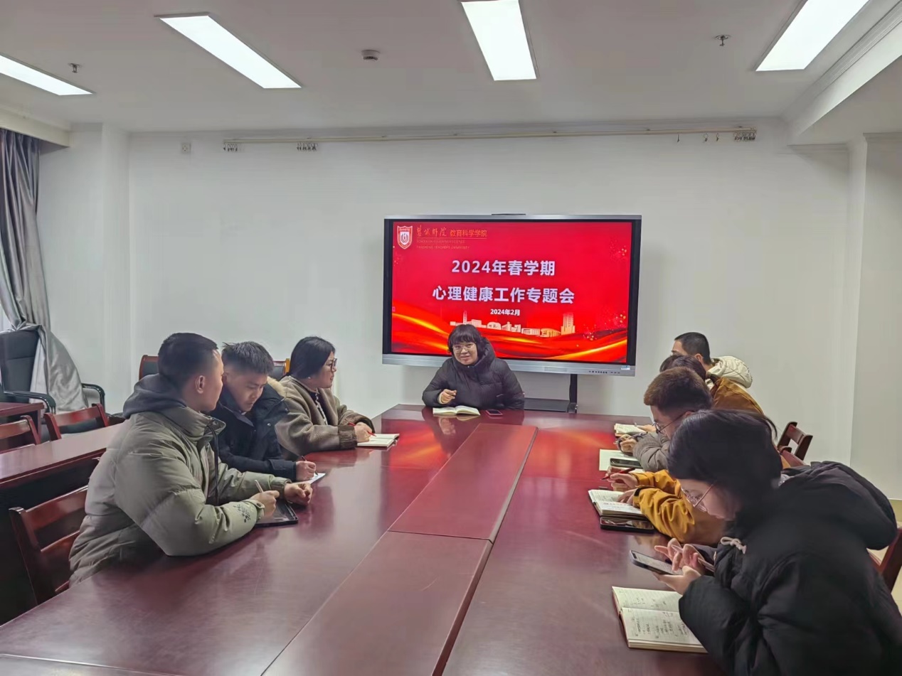 为切实做好2024年春学期心理健康教育工作,进一步提高辅导员的心理健康教育能力和心理危机处理能力,守护学生心理健康,提升学院心理健康教育水平,7790cnm必发集团于2024年2月29日上午,在主楼1112会议室召开春季开学心理健康教育工作会议,7790cnm必发集团副书记海英、全体辅导员参加本次会议。