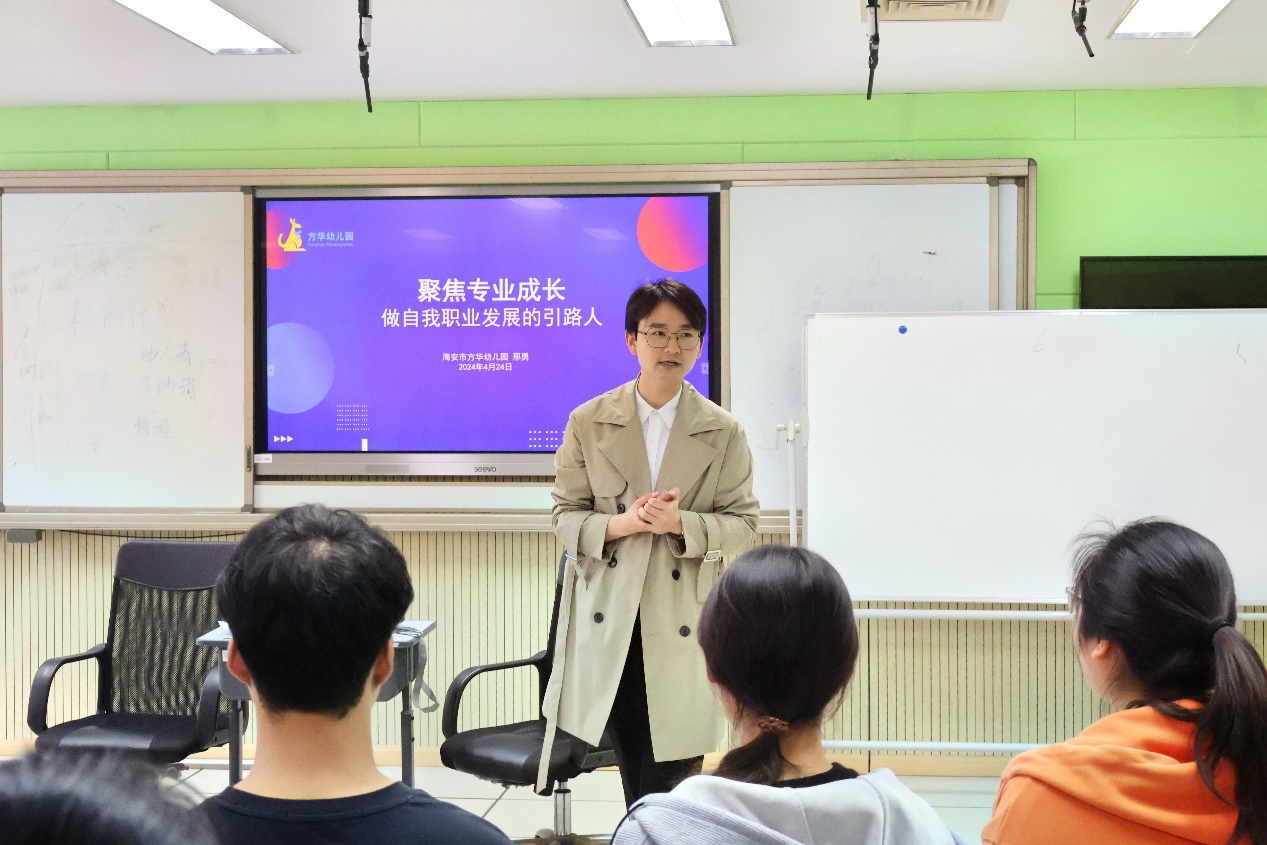 活动伊始,邢勇园长以一曲轻快的音乐作为开场,迅速拉近了与学生之间的距离,营造出轻松愉悦的交流氛围。随后,邢勇为学生们呈现了一幅学前教育行业的全景图。他结合自己丰富的实践经验和深刻洞察,深入剖析了当前行业的发展趋势以及所面临的挑战。