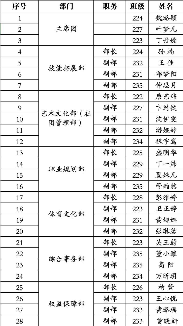 经个人报名、资格审查、面试等程序,拟聘用以下28位同学为学生会成员,现名单公示如下: