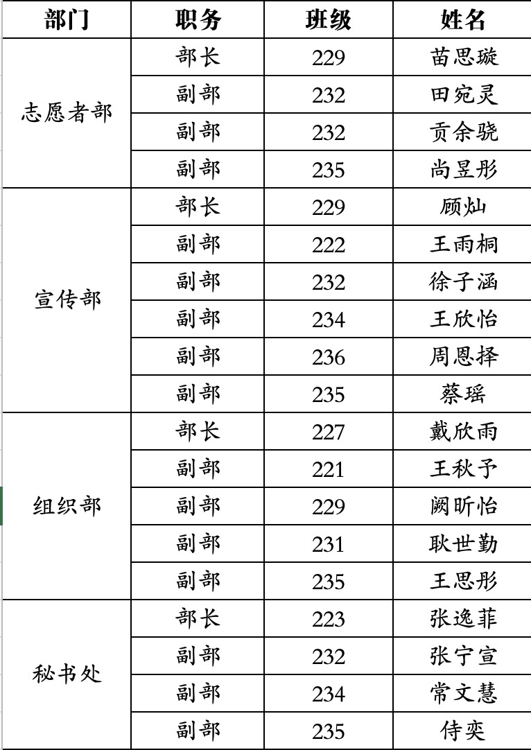经个人报名、资格审查、面试等程序,拟聘用以下 19位同学为团委成员,现名单公式如下: