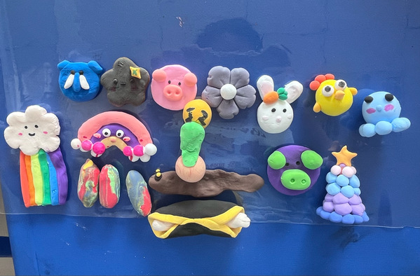 活动伊始,孩子们与支教老师之间有些许的生疏,但随着陈贾璐老师打开一盒盒橡皮泥,并鼓励道:“大家可以用手中的橡皮泥捏出自己最喜欢的小动物,或者用颜色表达自己最喜欢的天气哦!”孩子们迫不及待地揉搓、塑形,将天马行空的想象化作指尖跃动的色彩。有的孩子捏出了一只小兔子,并给它加上了好看的胡萝卜发夹;有的用彩色与白色交织,捏出了可爱的彩虹与云彩;还有的以金黄橡皮泥和橙色橡皮泥塑成小太阳,给它画上笑脸……这些作品无不体现出孩子们的童心与童趣。