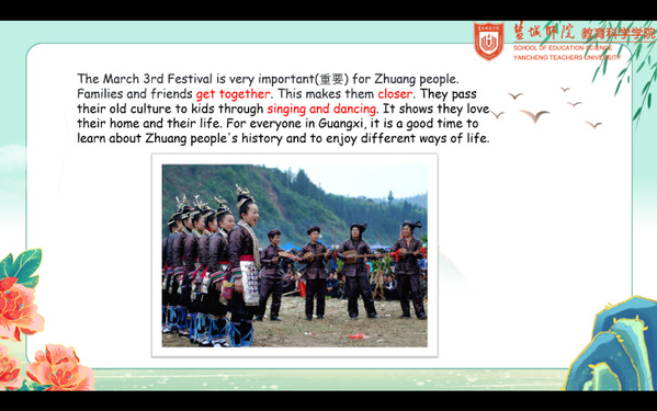 我还以壮族传统节日“三月三”为主题,开展了系列英语表达活动。我和孩子们一起追寻其来源、活动、意义,并与他们一起唱起了山歌。他们歌声嘹亮,唱出了作为一个广西人、身为一个中国人的骄傲。
