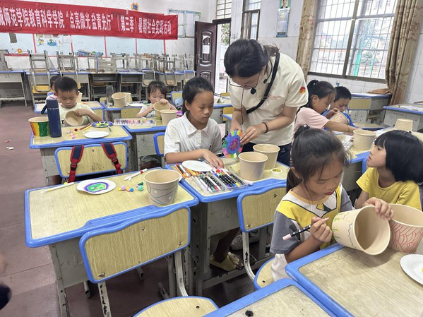 在教授“壮族铜鼓”和“壮锦团扇”时,同学们跟着我的思路,按照我逐步讲解的步骤和方法,一步一步完成了作品创作。在这个过程中,大家不仅掌握了相关的制作技巧,还深入了解了壮族文化的精髓,体验到了传统手工艺的魅力。那一刻,我意识到,我带来的不仅仅是知识,更是一份陪伴与希望,是与他们共同探索世界、点燃梦想的火种。