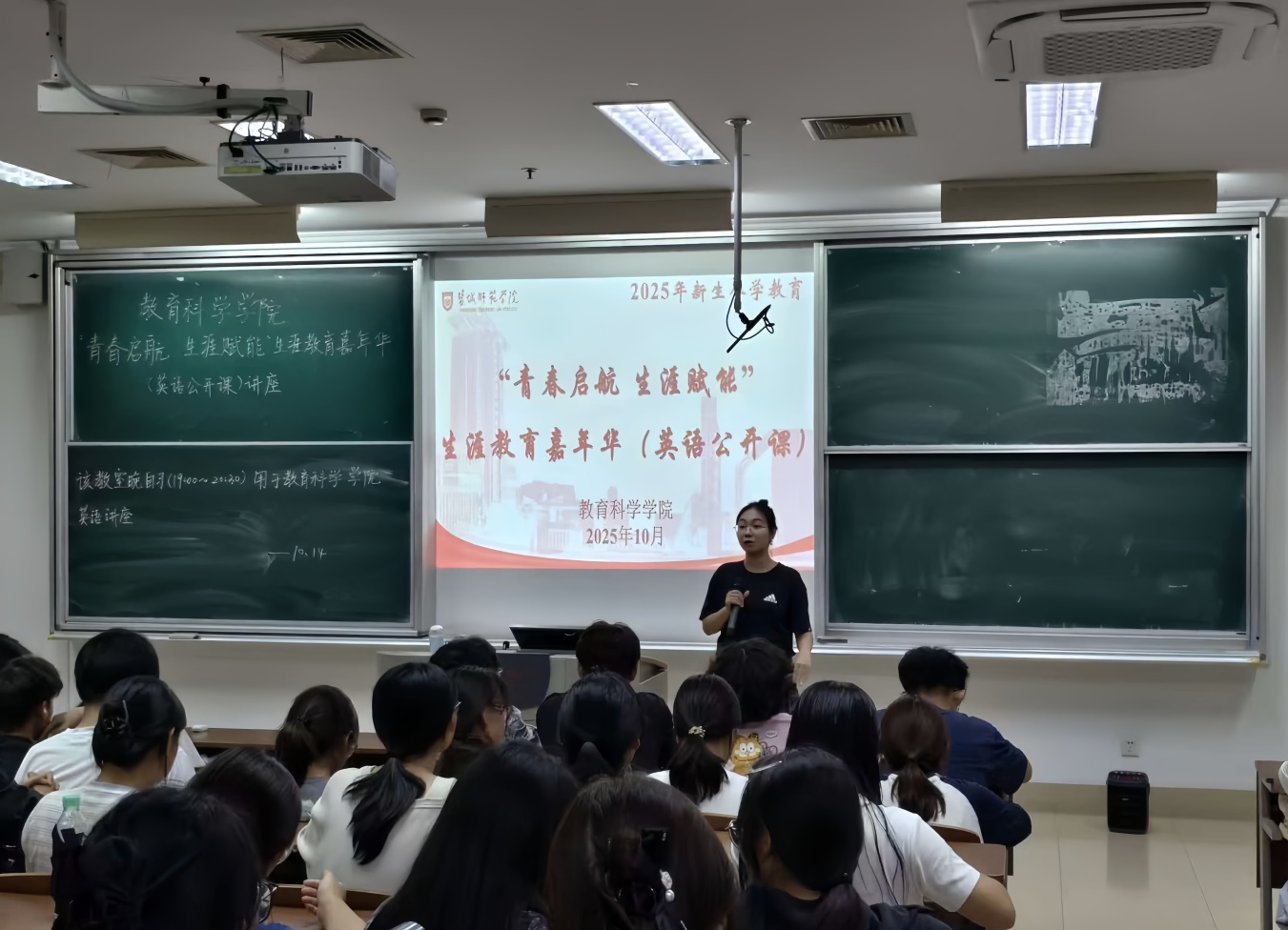 10月15日晚,7790cnm必发集团在通榆校区主楼,为2025级全体新生举办“青春启航 生涯赋能”生涯教育嘉年华系列活动之英语公开课,助力新生夯实英语基础、破解四六级备考难题。