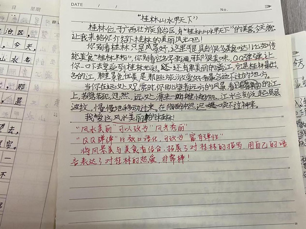 他们还问我写作课为什么叫“落笔生花”,我起初答不上来。看到他们写的作文后,我明白了,握着笔在纸上写下的字和句,如同撒下的花种子,用心书写,文字便能在纸上开出“花”。作为支教老师,我知道这不仅是传授写作技巧,更是以文字为舟,载着孩子们驶向更辽阔的精神世界,让他们借文字看见山外精彩与内心繁花。