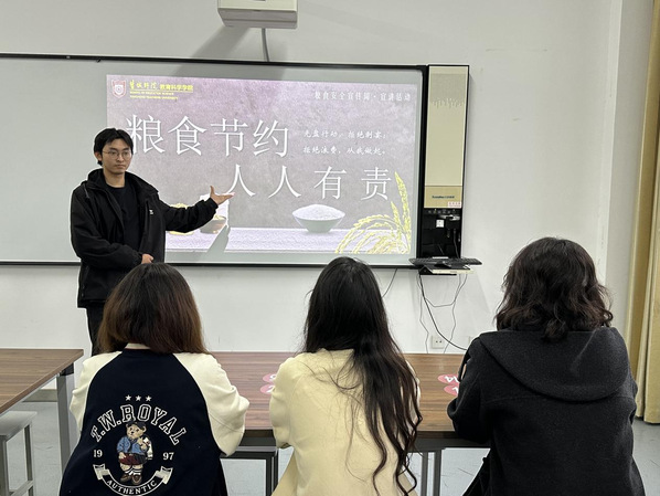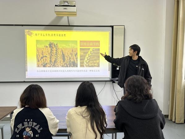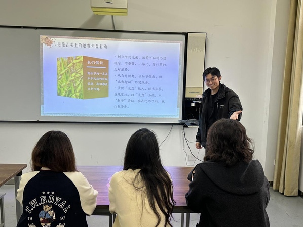 同学们一同经历了从“一粒种子到一碗米饭”的漫长旅程,宣讲员通过一组组严谨的数据,勾勒出粮食从生产、加工到运输链条中所投入的巨大社会资源与环境成本;又以日常生活中被无意倒掉的剩饭剩菜为镜,映出易被忽视的“微浪费”。在互动环节中,同学们积极分享了“节约小妙招”:从合理规划食堂打菜分量,到与室友拼单点外卖以减少套餐浪费;从旅行时随身携带环保餐盒,到在家中主动向家人宣传“光盘”理念。这些来自同龄人的真实经验汇成了践行节约的可行之路,让“人人有责”落地为具体可感的行为指南。