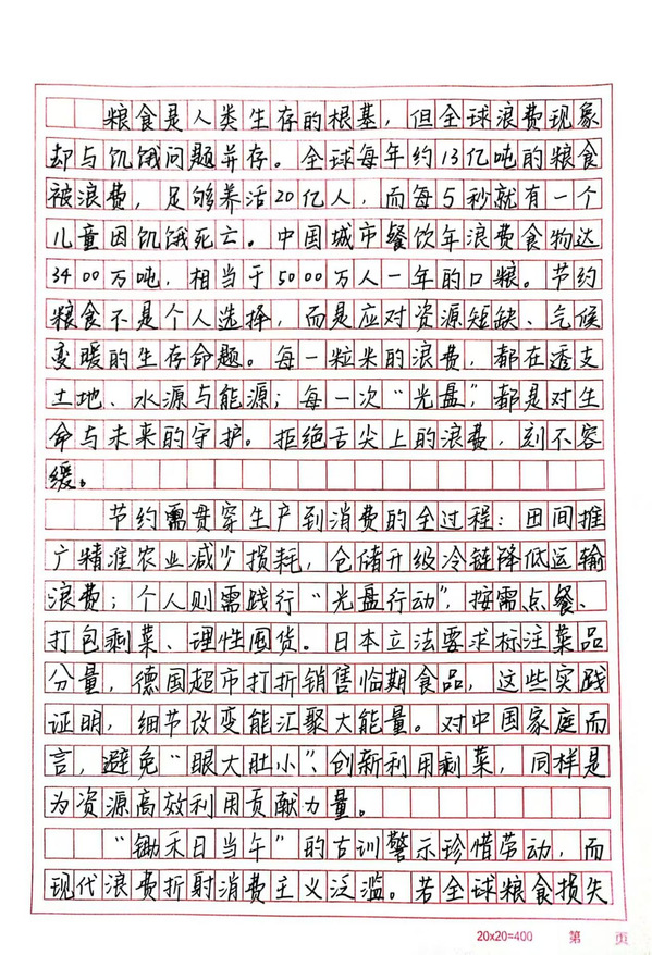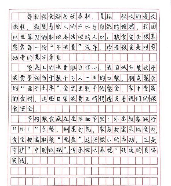 同学们踊跃执笔,立足自身经历,观照社会现实,以独特的视角与真挚的情感,诠释了节约粮食的深刻内涵与文化底蕴。有的同学深情记述“一粥一饭,当思来之不易”的家风传承与餐桌故事,将朴素的节俭习惯升华为温暖人心的家族记忆与文化基因;有的同学通过严谨的社会调研与数据分析,为构建校园长效节约机制建言献策,体现了当代大学生的社会责任与科学精神;更有同学生动勾勒出“足蒸暑土气,背灼炎天光”的农耕艰辛画卷,引领读者在文字间穿越四季,亲身感受粒粒粮食背后所凝聚的汗水与付出。