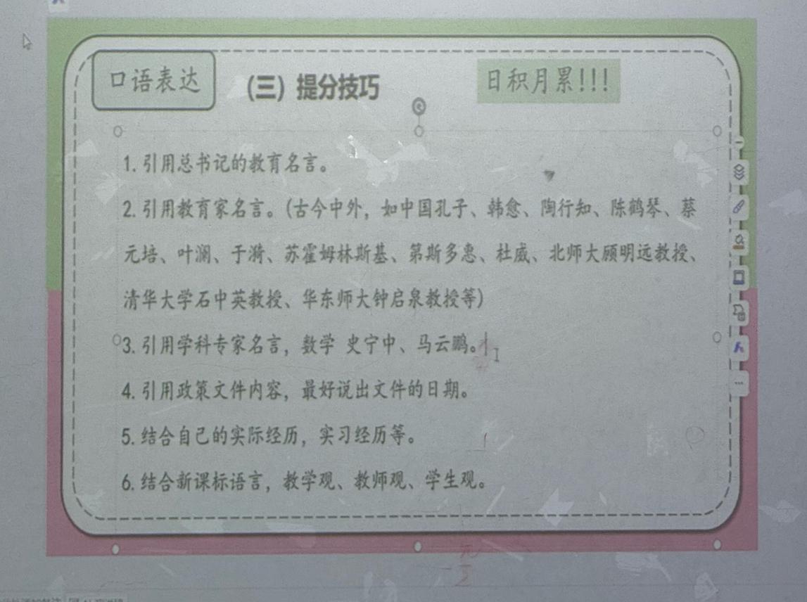 小教数学组获奖者朱轶敏同学聚焦教资与口语两大核心展开分享:她强调教资需稳扎知识体系、强化真题训练;而口语表达要遵循“总-分-总”结构——先破题明观点,再分点结合学科、自身经历或引用名言论述,最后总结收束,强调日常要积累总书记教育名言、教育家言论等表述等素材,让教学语言兼具专业深度与感染力。
