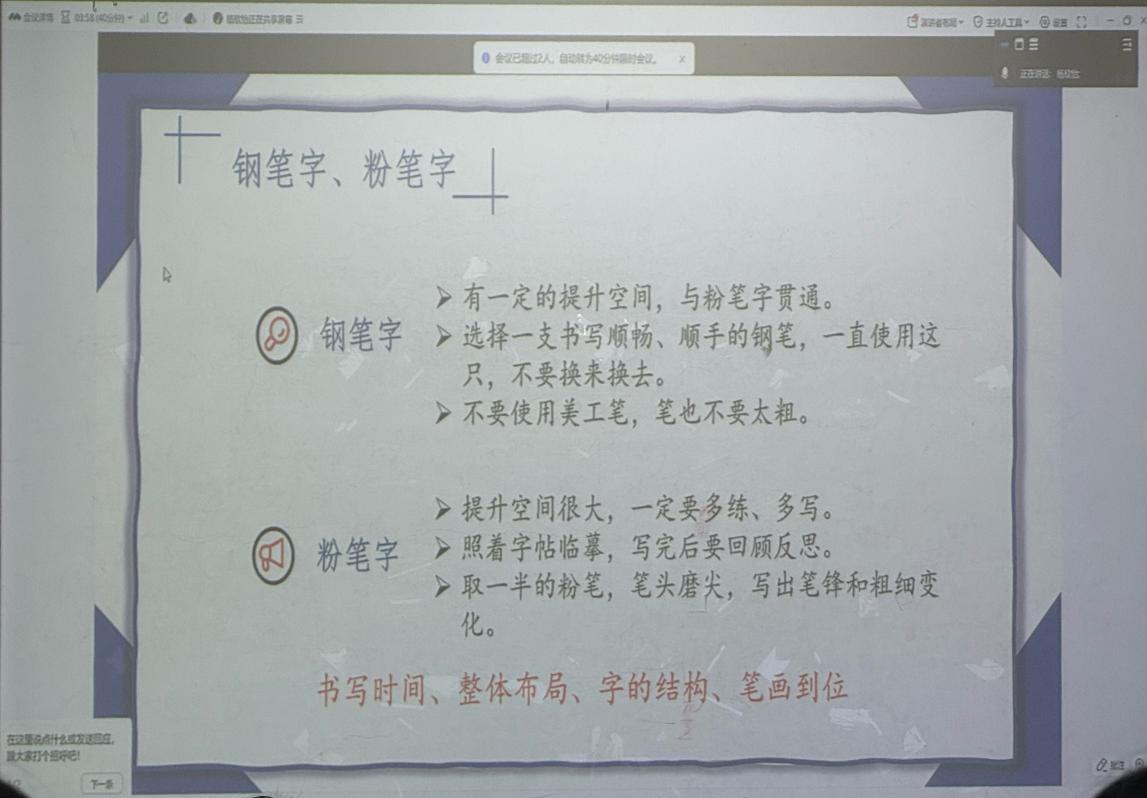 接着,小学数学组杨欣怡结合自身经验拆解“两字”技巧——钢笔字固定用顺手钢笔,粉笔字多练多复盘、截半支笔磨尖出笔锋,同时需注意书写时间、布局及笔画到位,避免错别字;教学设计则要紧扣课标,贴合小学生认知规律。