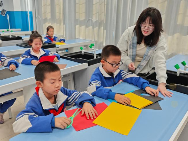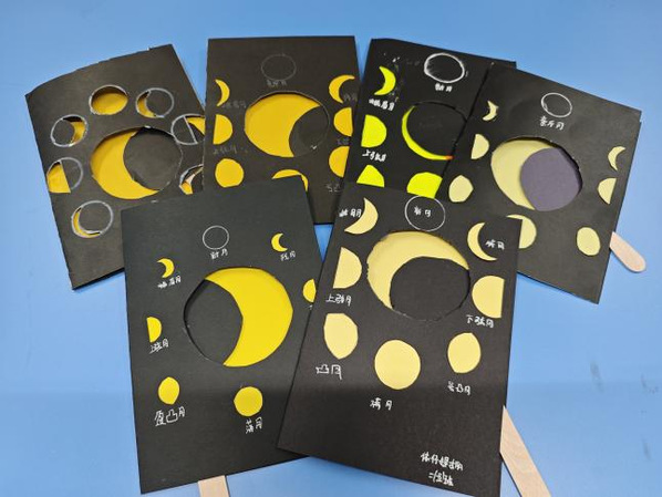 课程最后,孩子们化身“小小天文学家”,拿着剪刀和彩纸制作月相盘。有的小心翼翼剪裁“蛾眉月”,有的兴奋地将“满月”贴在圆盘中央,还有的互相帮忙分享成果,教室里满是欢声笑语。“老师,我以后每晚都要对着它认月亮!”一个小男孩举着亲手制作的月相盘,骄傲地向我展示。看着孩子们脸上洋溢的满足笑容,我深深感受到:教育不是生硬的讲解,而是让知识在实践中自然生长。