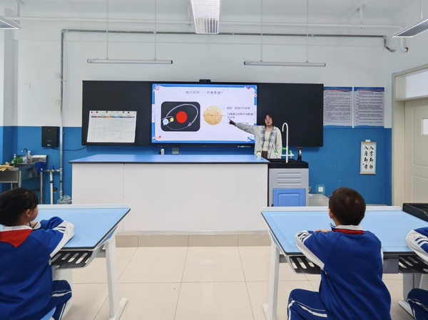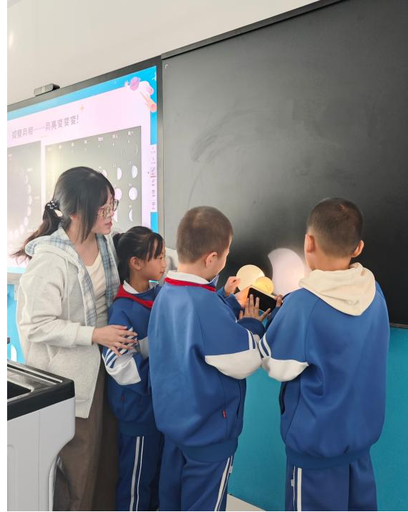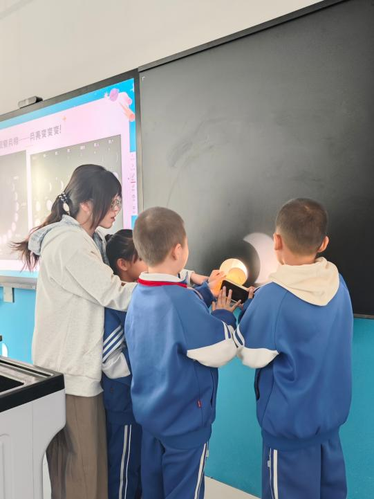 “想知道月亮为什么会变样子吗?我们一起来变魔术!”我拿出纸杯、黄色圆片,邀请学生上台配合——纸杯当地球,圆片做月球,熄灭灯光后,“月球”缓缓绕着“地球”转动。教室里静得能听见呼吸声,墙上的影子从细细的“蛾眉月”,渐变成半圆的“上弦月”,最终化为圆满的“满月”。“原来月亮在绕地球跑呀!”一个男孩恍然大悟,台下孩子纷纷举手分享发现。随后播放月食动画,扎马尾的小姑娘精准说出“地球挡住了太阳光”,让我惊喜不已。