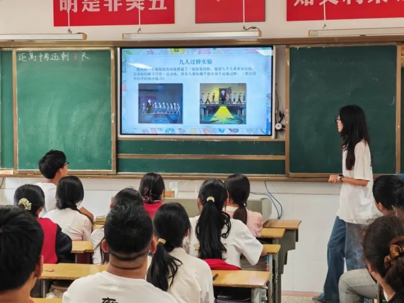 老师通过“九个人过桥实验”让学生们深刻感受到心理暗示对情绪的影响。实验一开始,学生们如履平地地通过一座“桥”,没有任何压力。然而,当老师打开灯光,展示出“桥下的鳄鱼”时,学生们的心理发生了剧变,从容自信瞬间转变为恐惧不安。该实验让学生们认识到,面对压力时,自己对未知的恐惧往往比实际情况更加严重。接着,老师向大家展示了如何通过心理暗示缓解压力。通过想象走过坚固的铁桥,学生们逐渐意识到,不是情境的改变,而是我们如何调整自己的心态,才能克服内心的恐惧。“就像大家复习时的知识储备一样,你们已经在不知不觉中积累了强大的力量。你们的‘安全网’就是这些知识和身边人的支持,”老师总结道。