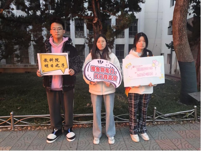 老师们早早地来到了集合地点,引导学生有序乘车并细心提醒学生查验所需证件等,亲切地与同学们交流,叮嘱他们放松心态。现场,学院准备了有寓意的糖果,每一颗都藏着美好的祝愿,还特别贴心地送上了“温暖手宝”,在严寒中为他们传递实实在在的温暖。学生代表们也举着写满 “一研为定”“一定上岸”的加油牌,齐声喊出祝福,为考生们缓解散考前的紧张。