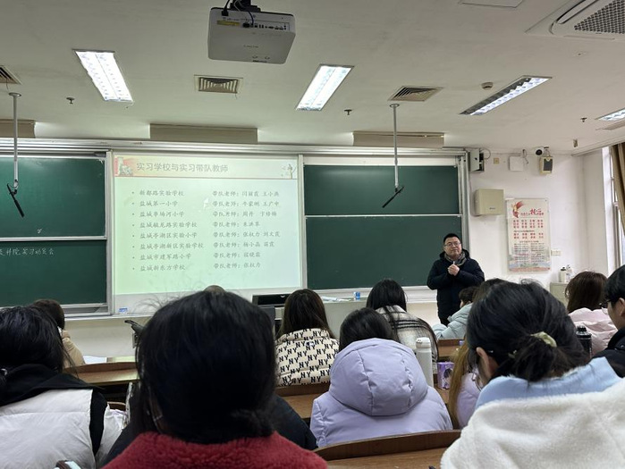 各实习带队老师结合所负责实习学校的实际情况,依次为实习生讲解针对性实习要求。朱洪翠老师针对毓龙路实验学校的实习要求,着重强调了实习期间的卫生规范、与校内教师相处的谦逊态度,以及严格履行正规请假制度;杨小晶老师聚焦亭湖新区实验学校,将安全问题作为核心要求反复叮嘱,要求实习生时刻绷紧安全之弦,筑牢实习安全防线;牛蒙刚老师对前往盐城第一小学实习的学子,明确提出着装整洁、言行得体的具体礼仪准则,要求注重个人职业形象;宿晓霜老师就建军路小学的实习要求作出明确说明,要求实习生每日携带学生证、校徽,严守考勤纪律,杜绝迟到早退,放假时间严格遵循实习学校安排。