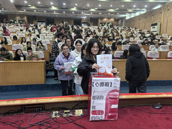 会议最后举行心愿箱投递仪式。同学们将写有个人发展目标的卡片郑重投入心愿箱,或考研上岸、或成功考编、或实现职业理想,以仪式感凝聚奋进共识,以目标引领未来征程。