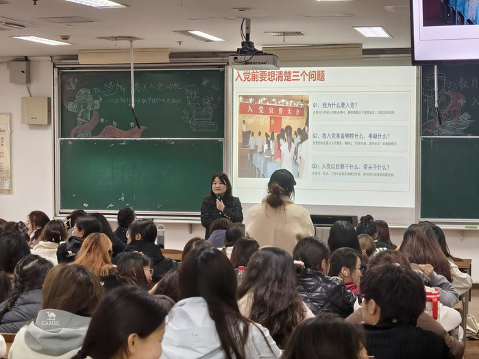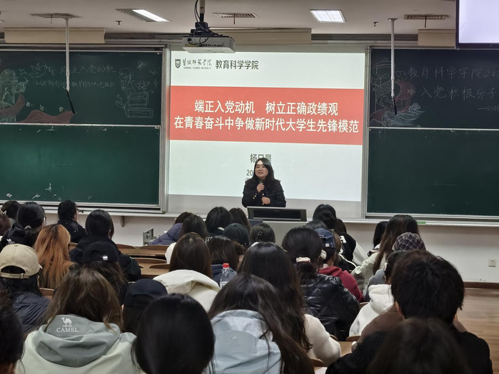 培训伊始,杨日晨围绕入党初心展开讲授,强调端正入党动机是争取入党的首要问题与根本前提。每一位积极分子都要深刻思考“为什么入党”,自觉摒弃功利思想,真正从信仰上认同党的宗旨,牢固树立全心全意为人民服务的初心,将其作为向党组织靠拢的内在精神动力。围绕 “树立正确政绩观,是青年的成长方向” 这一议题,她指出,青年学生要力戒浮躁、踏实做事,将个人理想与成长融入国家发展和党和人民的事业之中,不慕虚名、不务虚功,在日常学习、校园生活与志愿服务中主动担当、做好表率,从细微小事践行责任担当,以实干笃行书写青春华章。