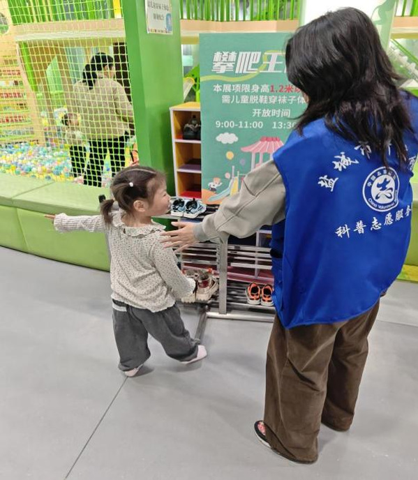 活动当天,志愿者们迅速分赴各展区,以饱满热情投入服务。在儿童科技乐园,志愿者们针对孩子们的认知特点,用童趣化语言拆解互动展品背后的力学、光学原理,手把手指导操作方法;同时主动维护现场秩序,引导家长与孩子有序排队,轻声提醒游玩安全细节,及时劝阻危险行为,全力营造安全有序又充满趣味的参观氛围。在展厅入口及各楼层通道,志愿者们耐心为参观者指引路线、解答开放时间、展区特色等咨询,协助工作人员疏导人流,主动帮扶老年参观者及携带幼儿的家长,用细致服务温暖每一位游客。